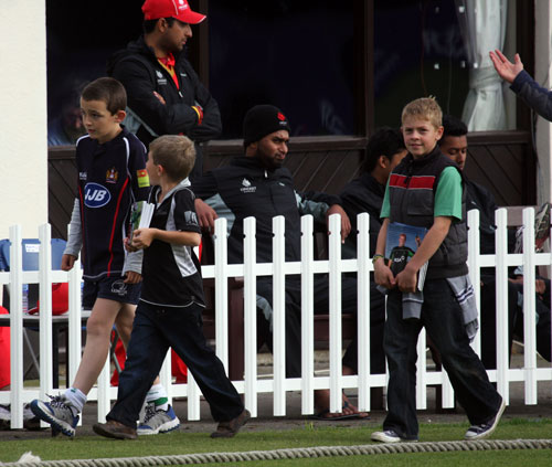 Trent Johnston congratulates Gary Wilson on his fifty