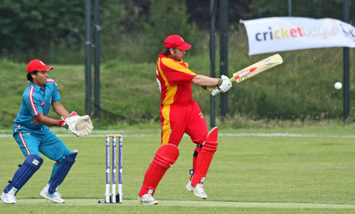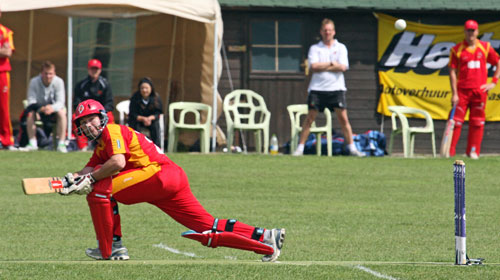 Qamar Abbas hits the stumps to get the run out