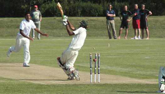 Denmark's Fazan Ahmed is bowled by Zeeshan Faiz