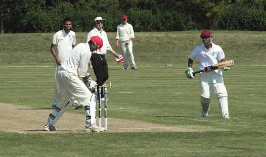 Denmark's Salim Mondozay is bowled by Zeeshan Faiz