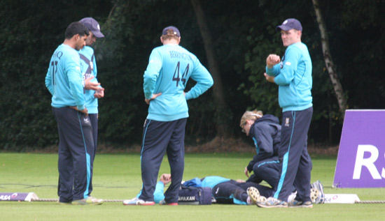 Matt Machan receives treatment after a boundary fall