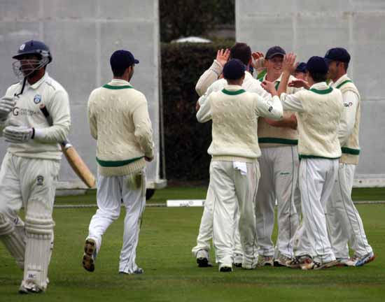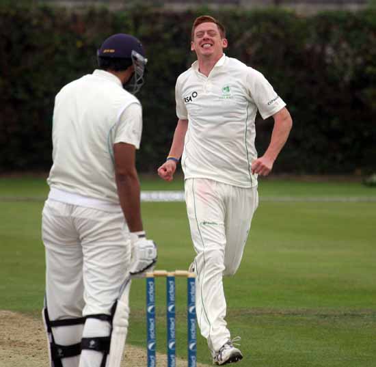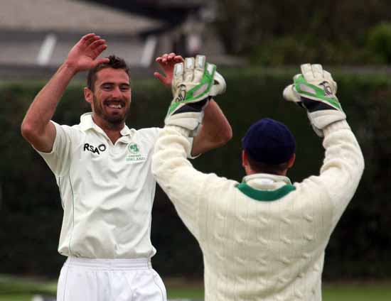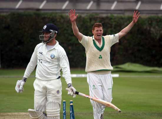 Kevin O'Brien celebrates the wicket of Craig Wallace