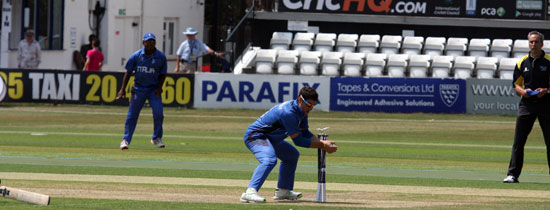 Benjamin Stevens is run out by a direct hit from Peter Petricola