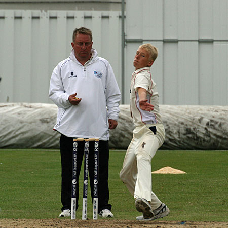 Umpire Jareth McCready keeps a close eye on the bowler in his delivery stride