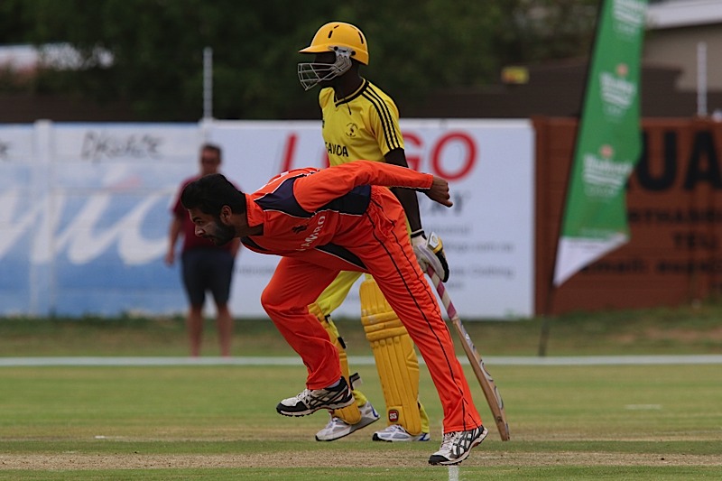Matthijs van Schelven of the Netherlands bowls against Uganda
