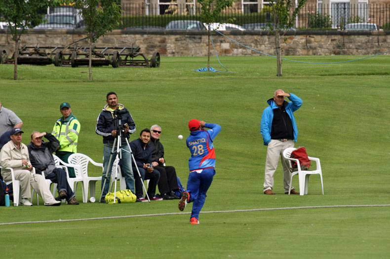 Rajeshkumar Ranpura takes a catch on the boundary to dismiss Aftab Alam