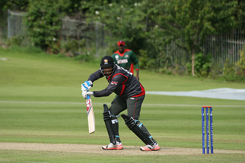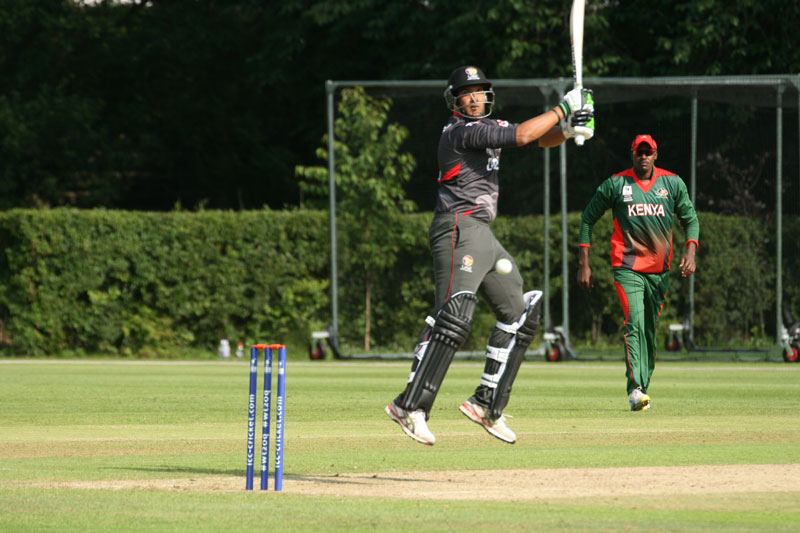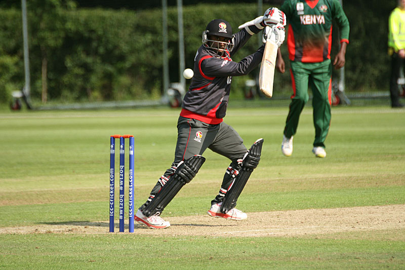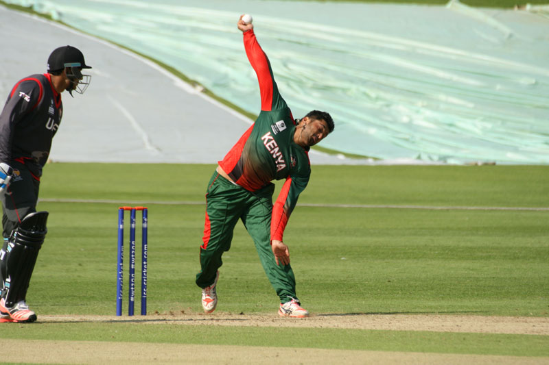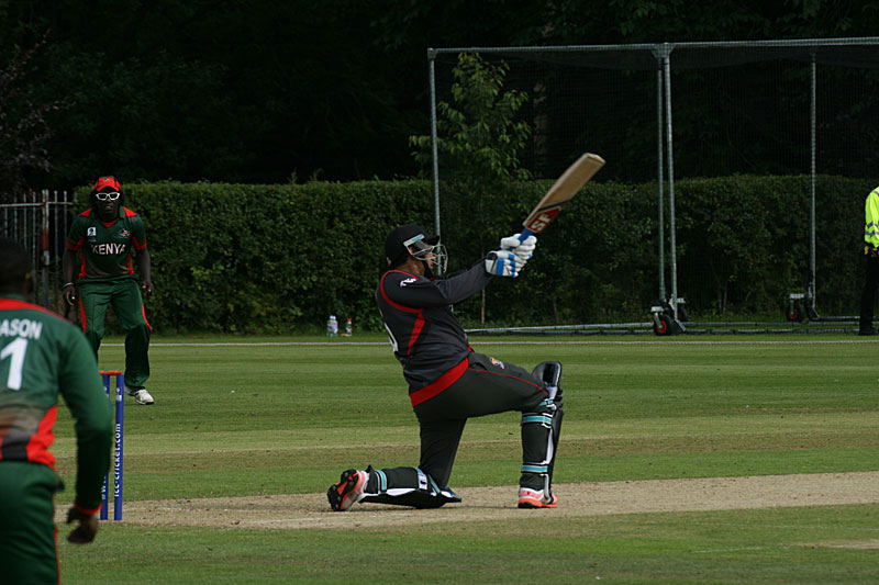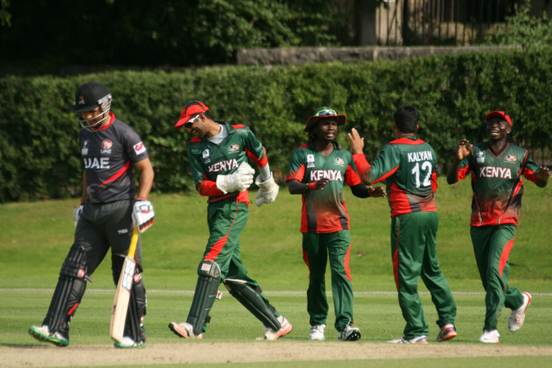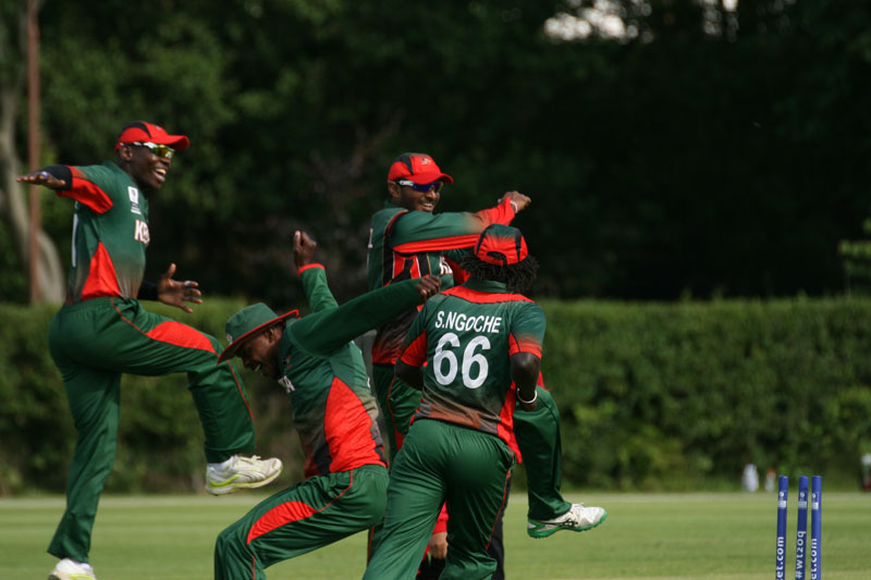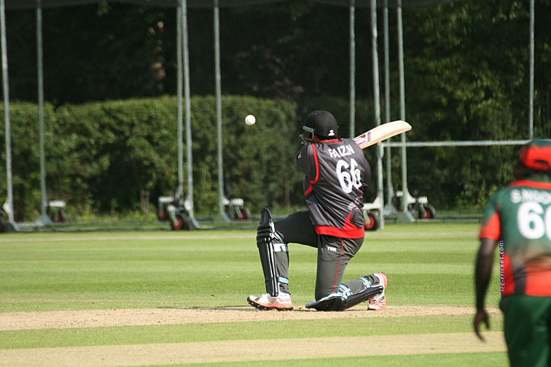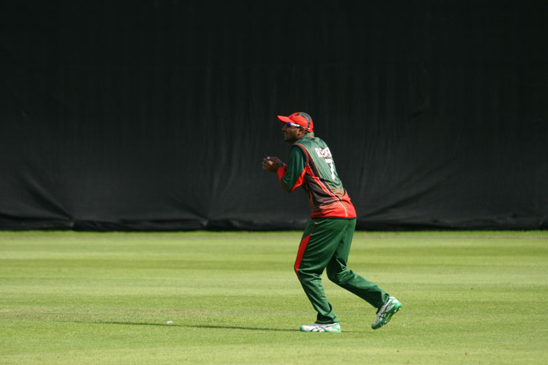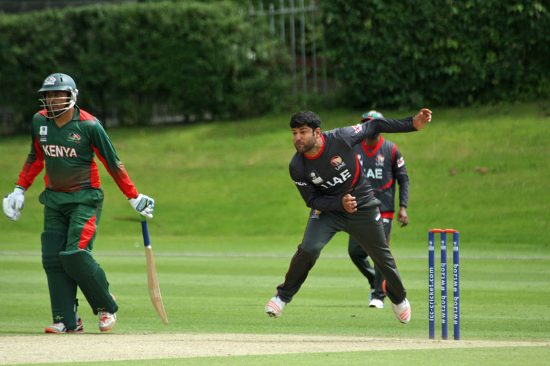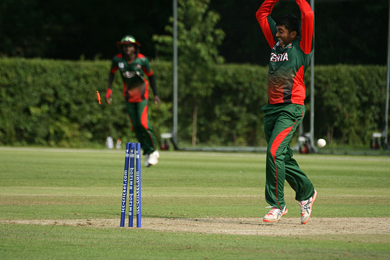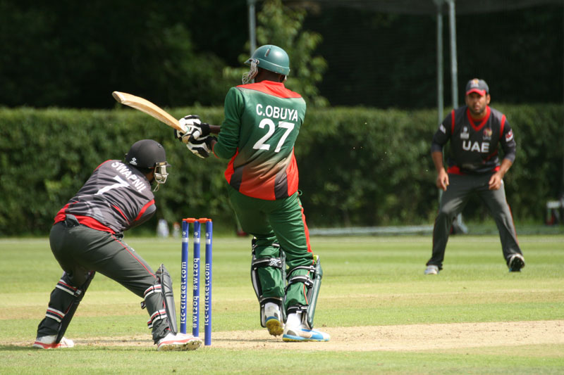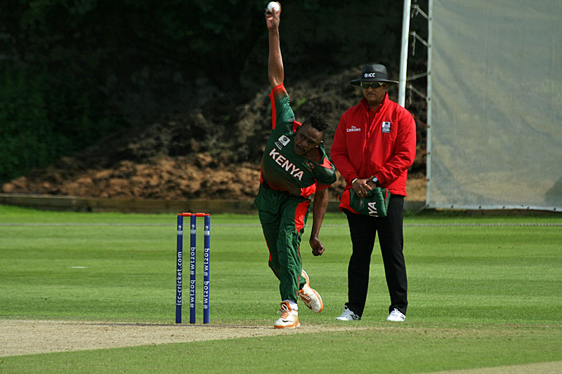 Faizan Asif takes the catch to dismiss Collins Obuya