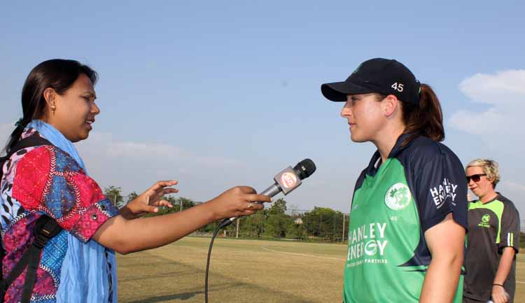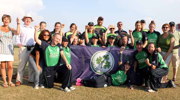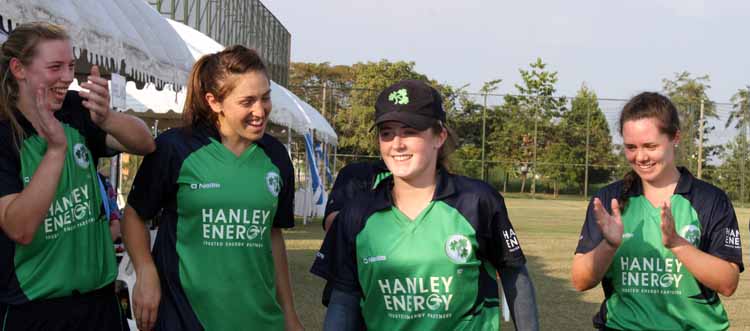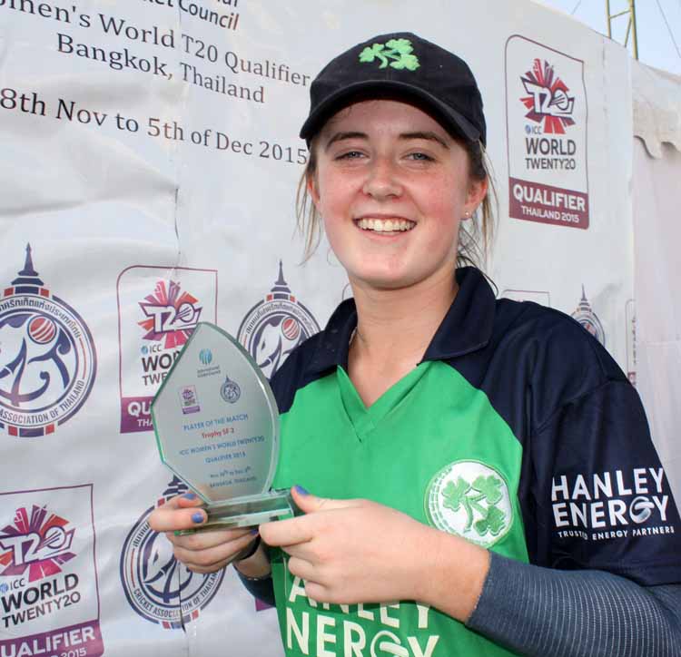 Cricket Ireland President Dr Murray Power congratulates Isobel Joyce on T20 World Cup qualification