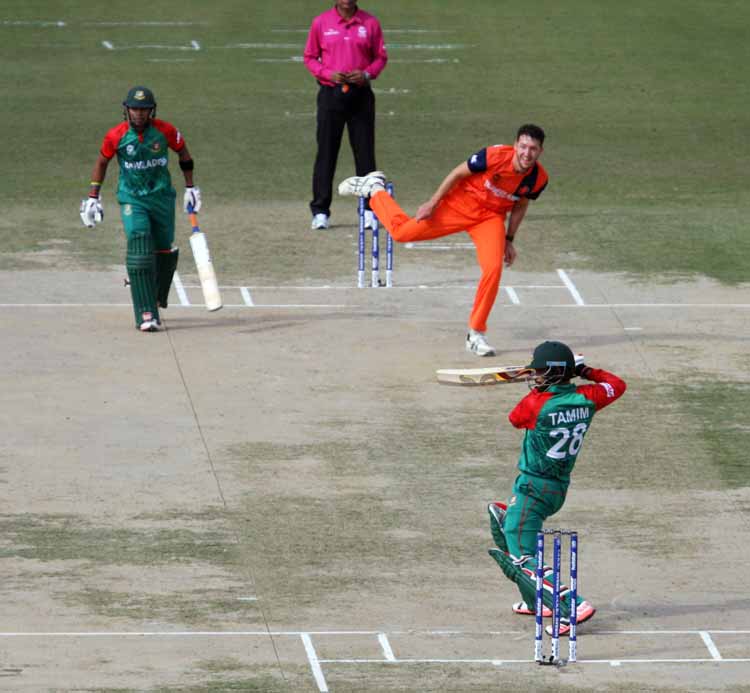 Shakib bowling to Peter Borren