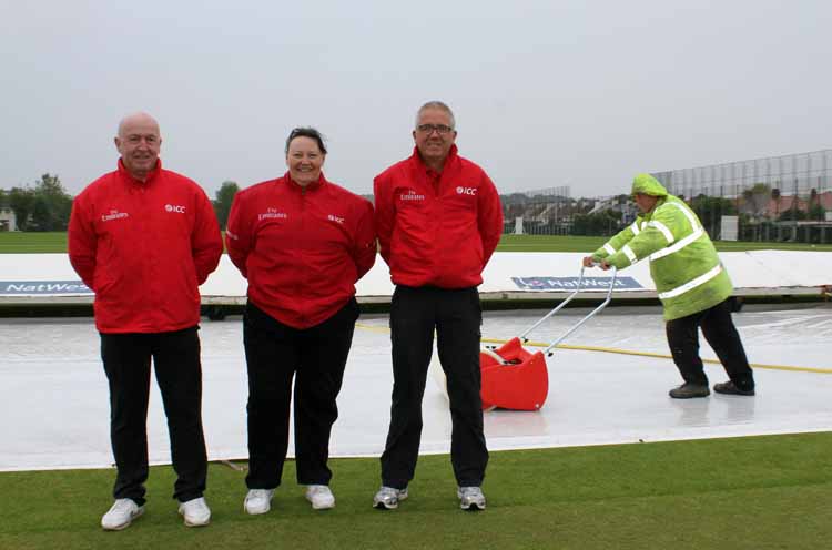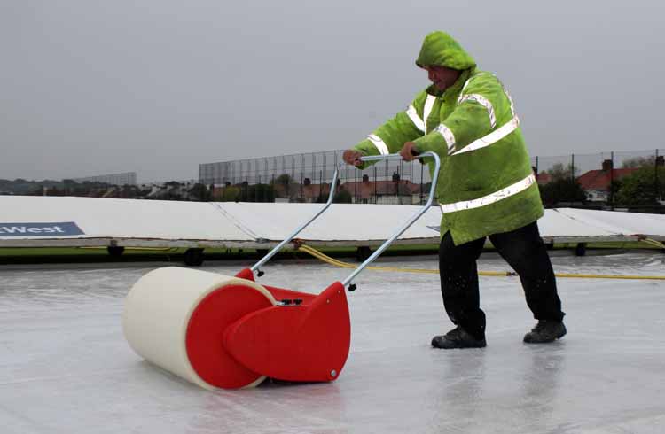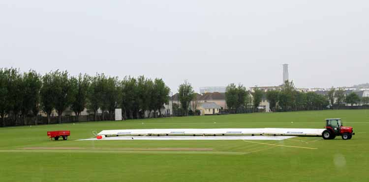 Callum Blake bowling as the rain gets heavier forcing the teams from the field