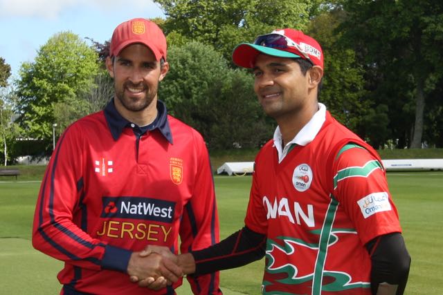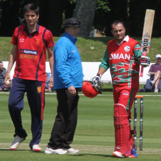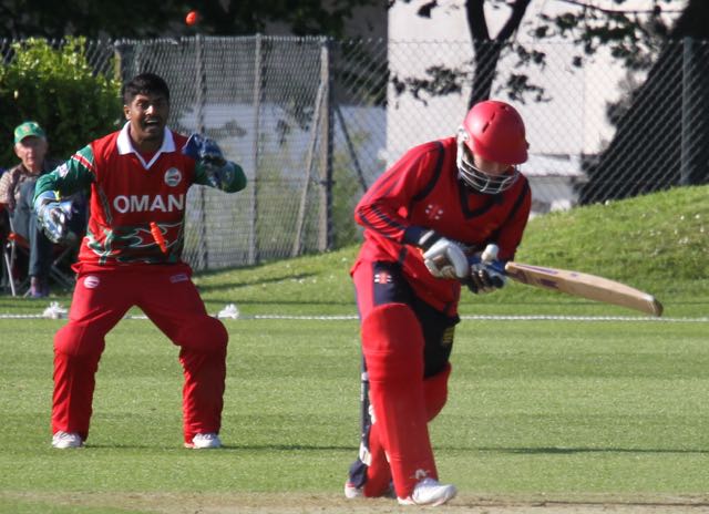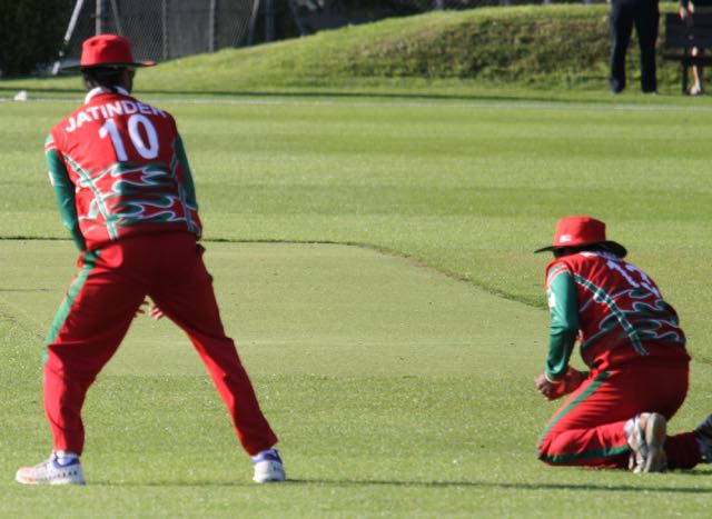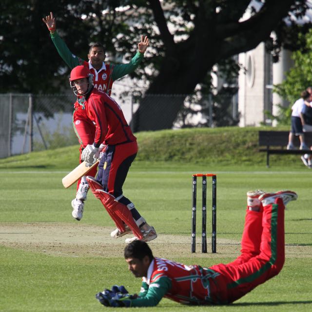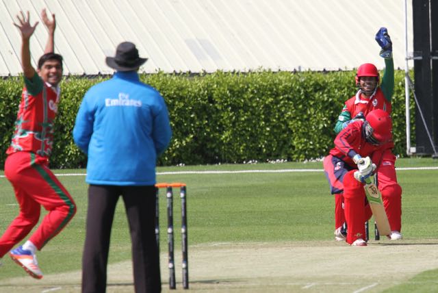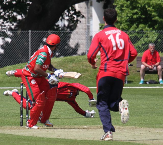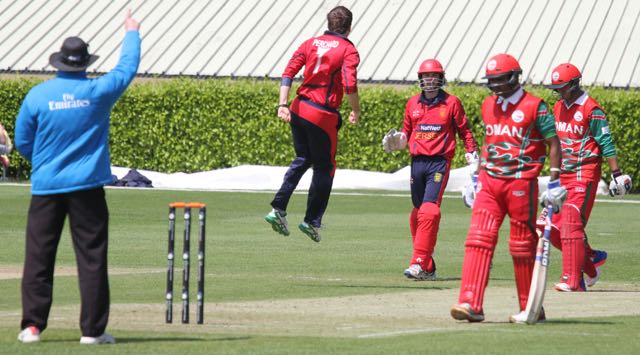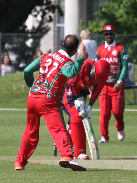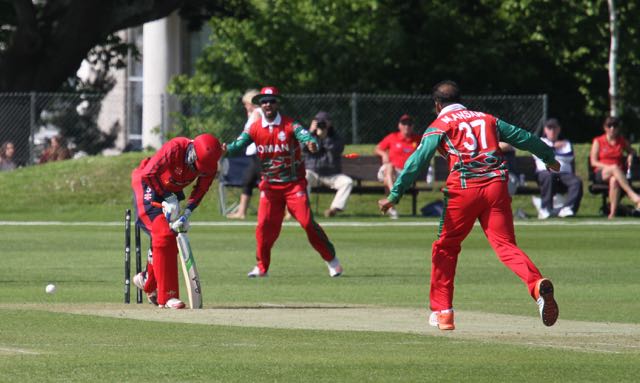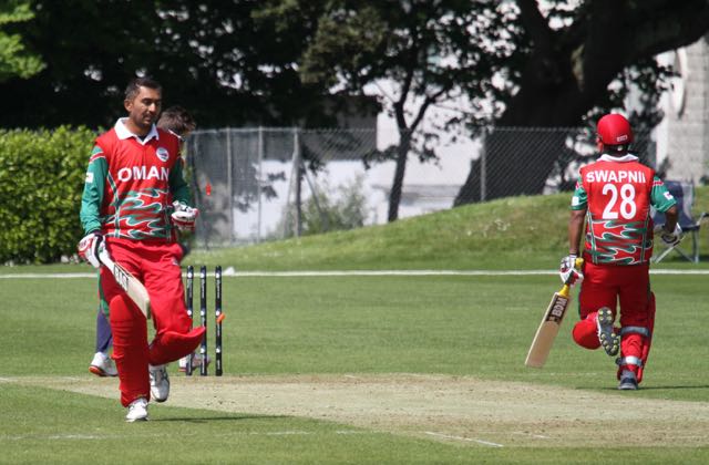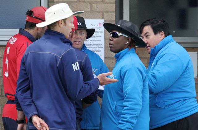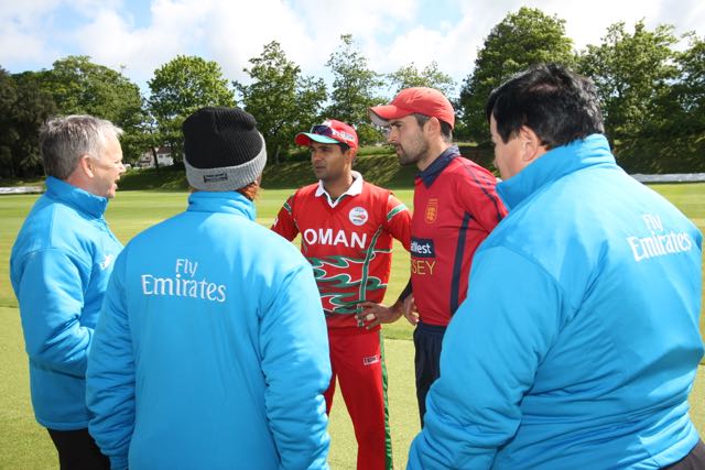 Officials explain to Neil McRae and Peter Gough that Oman have refused to allow a replacement for the post toss injury...