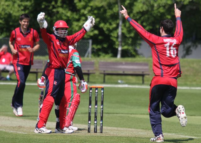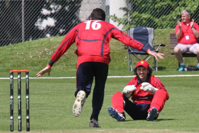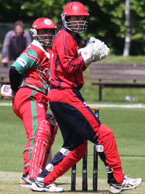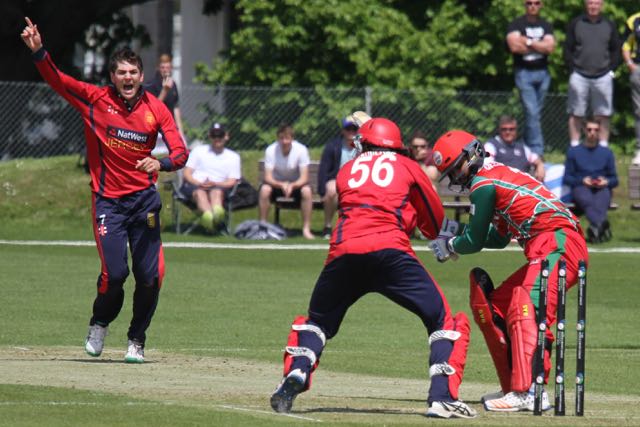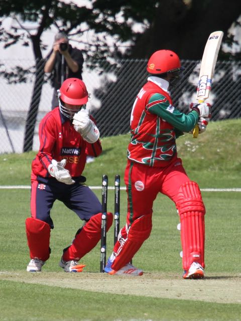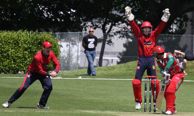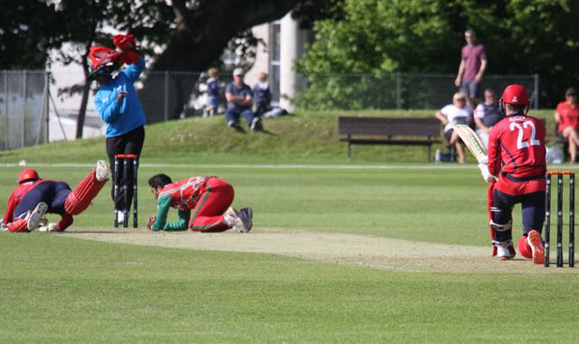 Hawkins-Kay is well taken down the leg side by keeper Khadye
