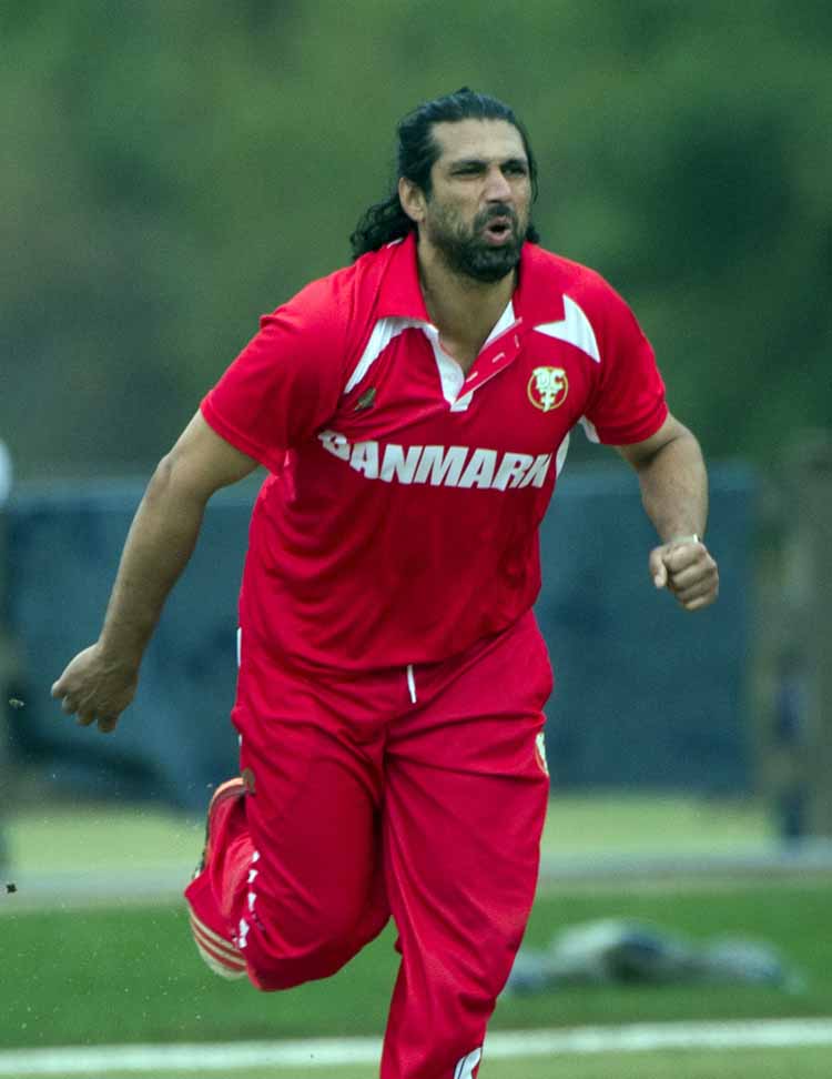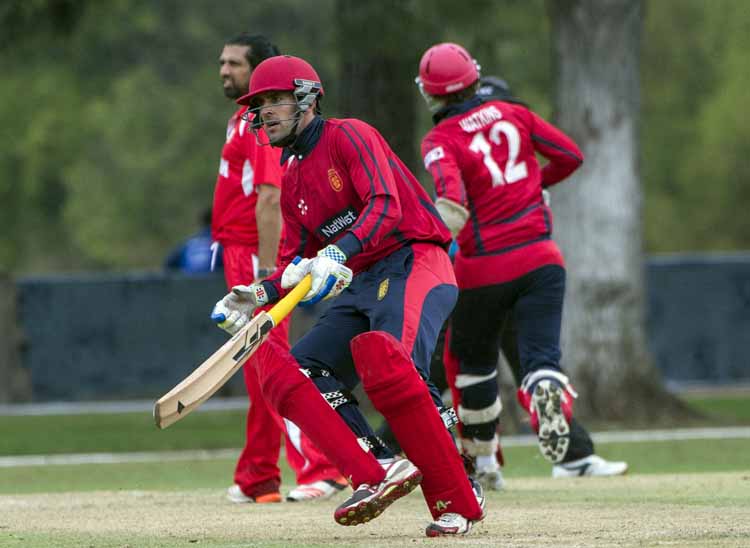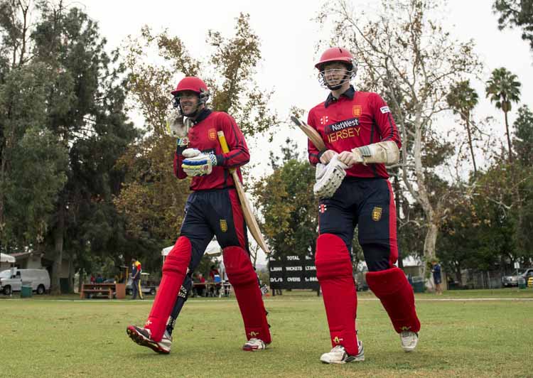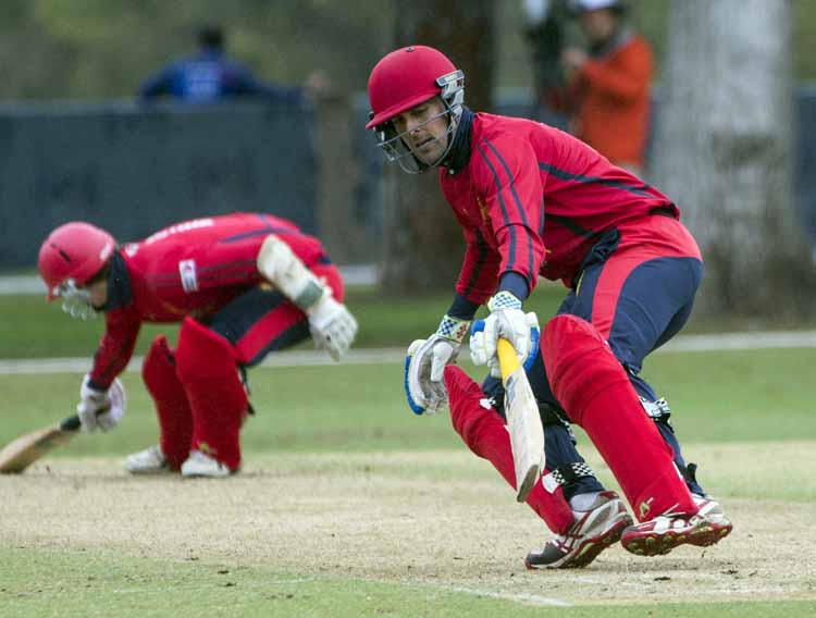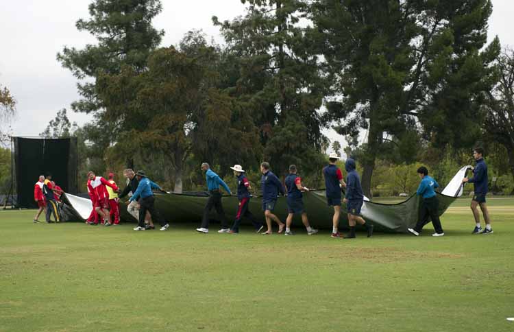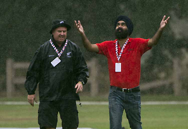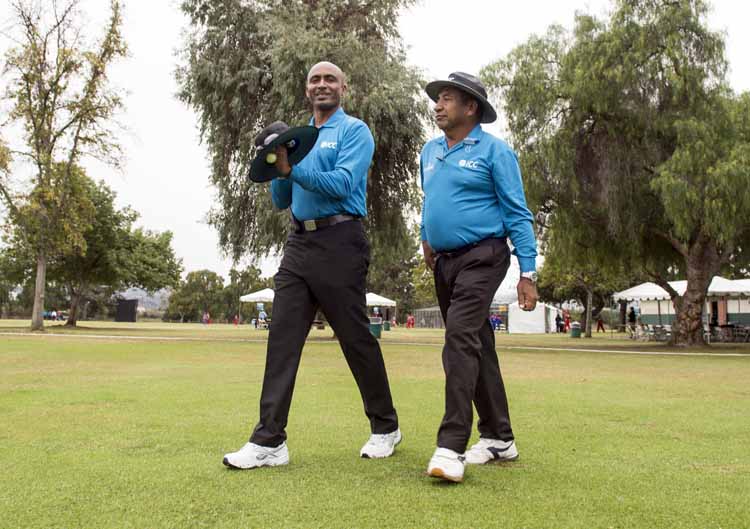Umpires Gregory Brathwaite and Uli Kapa take the field.