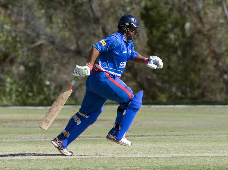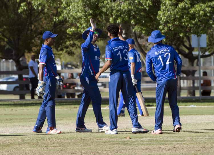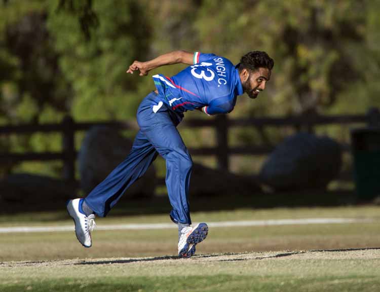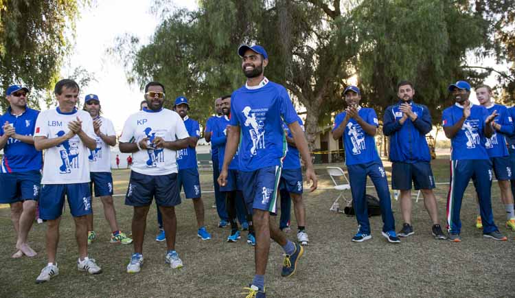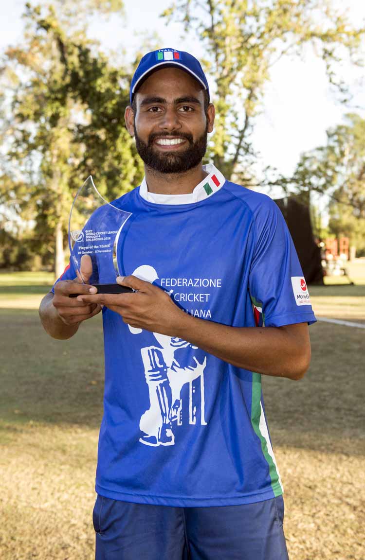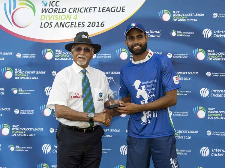 Man of the match, Charanjeet Singh, receives his trophy from tournament referee, Dev Govindjee.