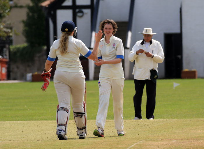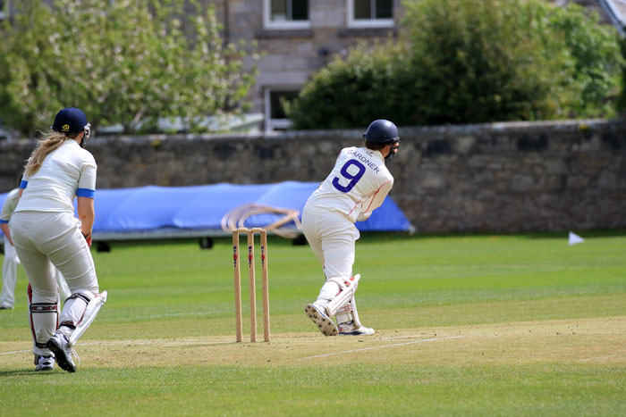 Kathryn Bryce watches the ball as it goes over mid-wicket