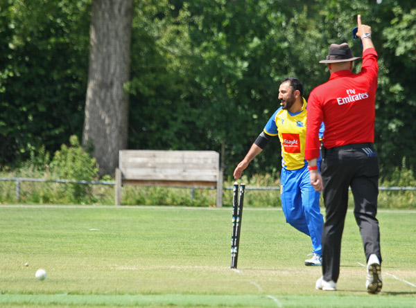 Waqas Ahmed is run out after a direct hit from Venkatesh