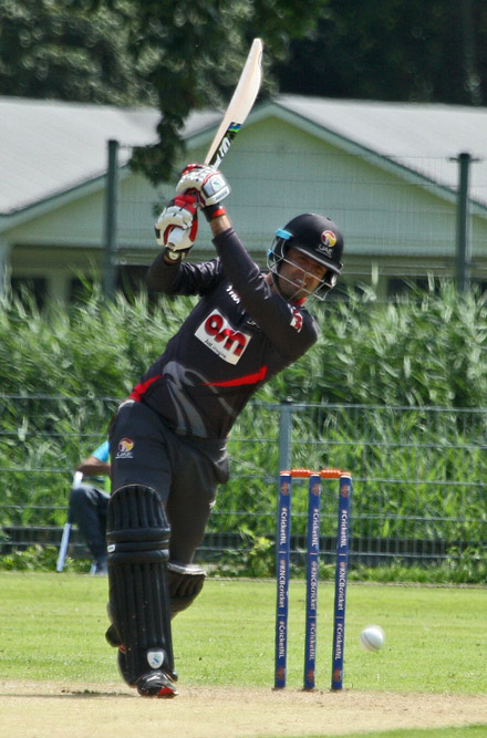 Shahzad lofts a straight drive...