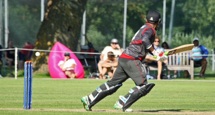 Amjad Javed belts the ball over the rope and it's game over
