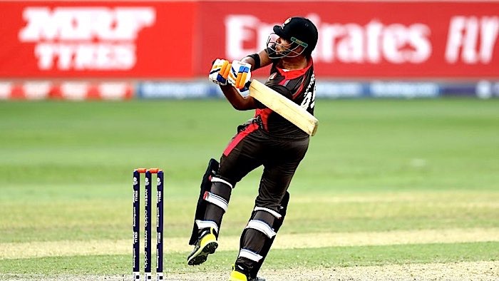 Keeper Matthew Cross takes the catch to remove Chirag Suri in the first over of the UAE innings