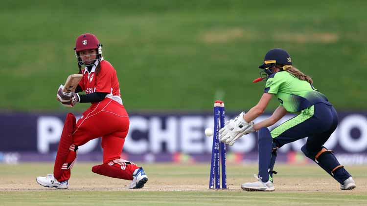 Annabel Squires of Ireland is bowled by Ni Luh Ketut Dewi of Indonesia
